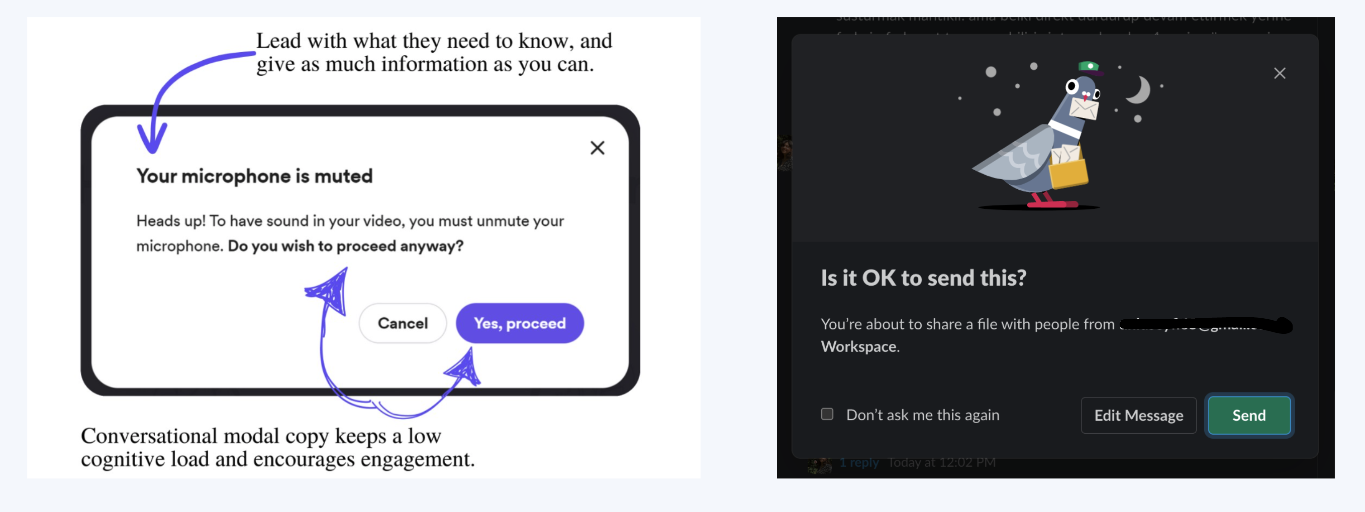 Druhý příklad ze Slacku zase upozorňuje, že jdu sdílet něco mimo svou organizaci a raději se ptá dvakrát, jestli je to cajk.
